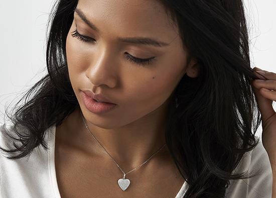 This half heart memorial pendant is created in EverWith 925 Sterling Silver. It can be engraved on the reverse side with a perfectly reproduced fingerprint while the front of this heart-shaped pendant has a central vertical divide.