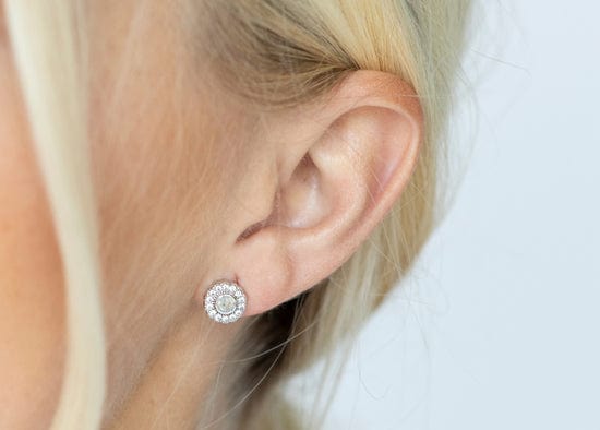 These Ladies Sterling Silver Petals Memorial Earrings with Fine Crystals are stud-style earrings with a butterfly clasp at the rear, all of which is made for 925 Sterling Silver with a Rhodium plating to prevent tarnishing. The small circular mount where the resin containing the cremation ashes, and the optional diamond dust, is surrounded by small lead crystals set to look like the petals of a tiny flower.