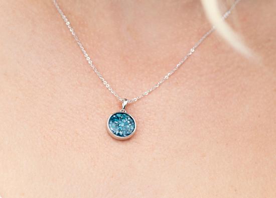 The Ladies Sterling Silver Classic Round Memorial Pendant has a simple round mount where the beauty of the cremation ashes held suspended and visible within the coloured resin can really be appreciated. This pendant and the included 45-cm adjustable chain are of 925 Sterling Silver with a Rhodium plating.