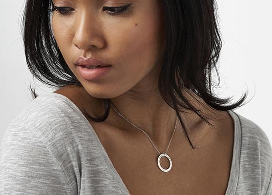 This ring-shaped pendant made of EverWith 925 Sterling Silver has a fine crystal set into it. The adjustable chain passes directly through the ring. Our digital laser can engrave up to eight words, (depending on the length), in fine detail around the ring in a choice of three scripts, Allura Regular, Times New Roman, or Monotype Corsiva